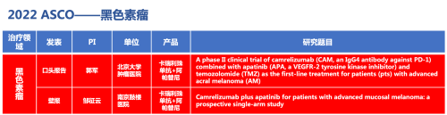 黑色素瘤领域的2篇研究摘要,采用Ag尊龙凯时医药自主研发的PD-1抑制剂卡瑞利珠单抗(艾瑞卡)联合阿帕替尼(艾坦)(“双艾”组合)的免疫联合抗血管(或再联合化疗)的治疗策略。